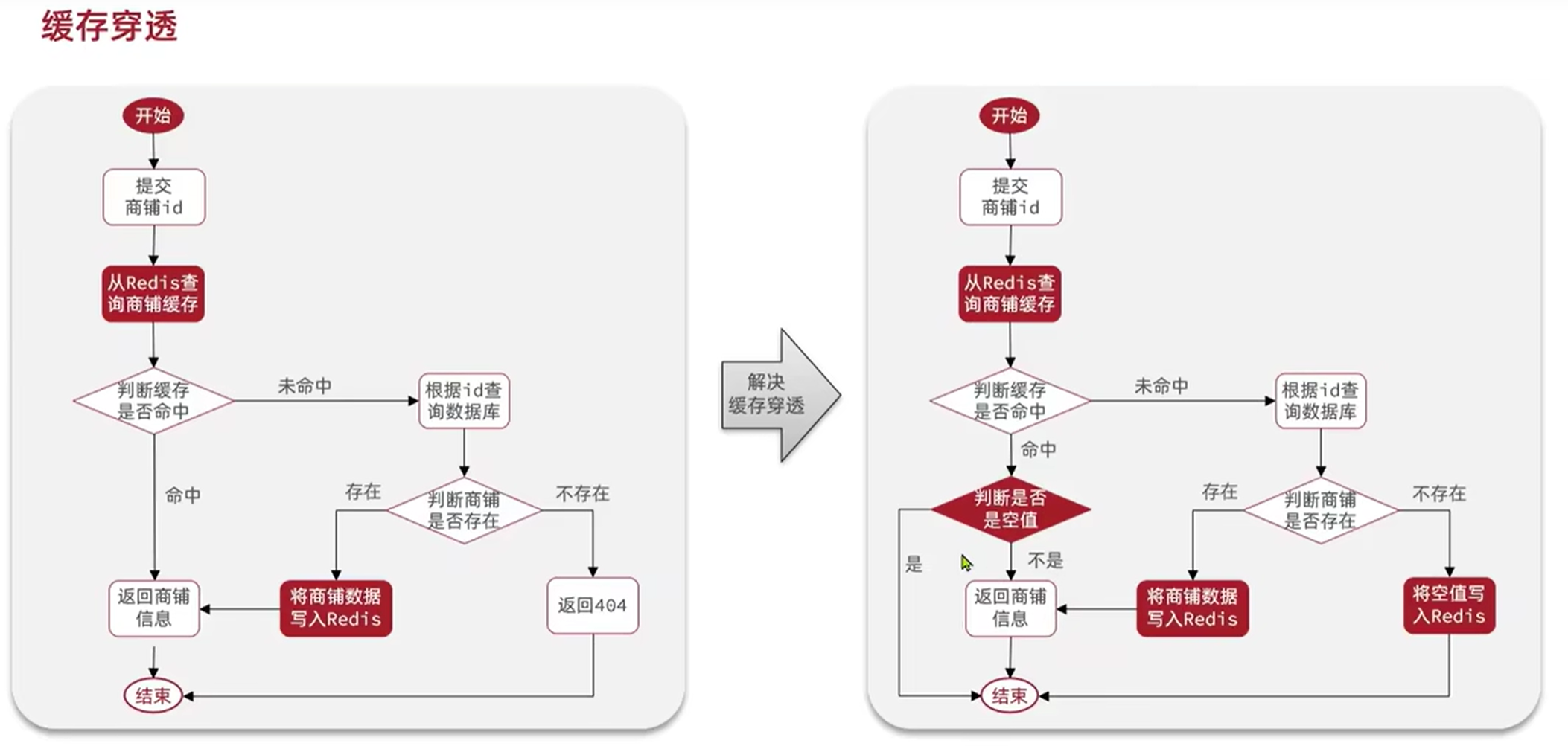 | public Shop redisPassThrought(Long id) { String key =RedisConstants.CACHE_SHOP_KEY+id; String s= stringRedisTemplate.opsForValue().get(key); if (StrUtil.isNotBlank(s)) { return JSONUtil.toBean(s,Shop.class); } if (s!=null){ return null; } Shop shop =getById(id); if (shop != null){ stringRedisTemplate.opsForValue().set(key,JSONUtil.toJsonStr(shop),RedisConstants.CACHE_SHOP_TTL); } else { stringRedisTemplate.opsForValue().set(key,"",RedisConstants.CACHE_NULL_TTL); return null; } return shop; }